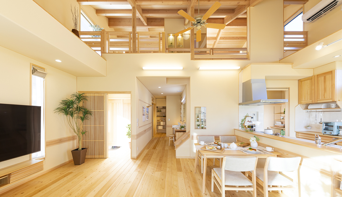 暮らしに必要な物は一切省かず、生活動線や家事スペースの配置は忙しいワーキングママ目線で。アトピー・ぜんそくのお子さんにも安心の無垢材のぬくもり、調湿性能。シックハウス症候群は無縁の超低ホルムアルデヒド数値。住まいには子育てに求める住まいのカタチが揃っています。家族のために妥協しない家づくり。若い家族の夢を応援します。